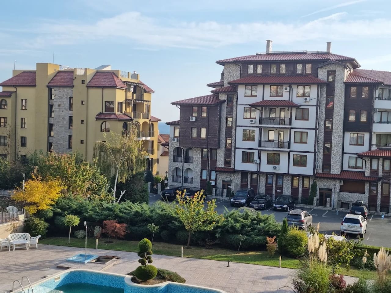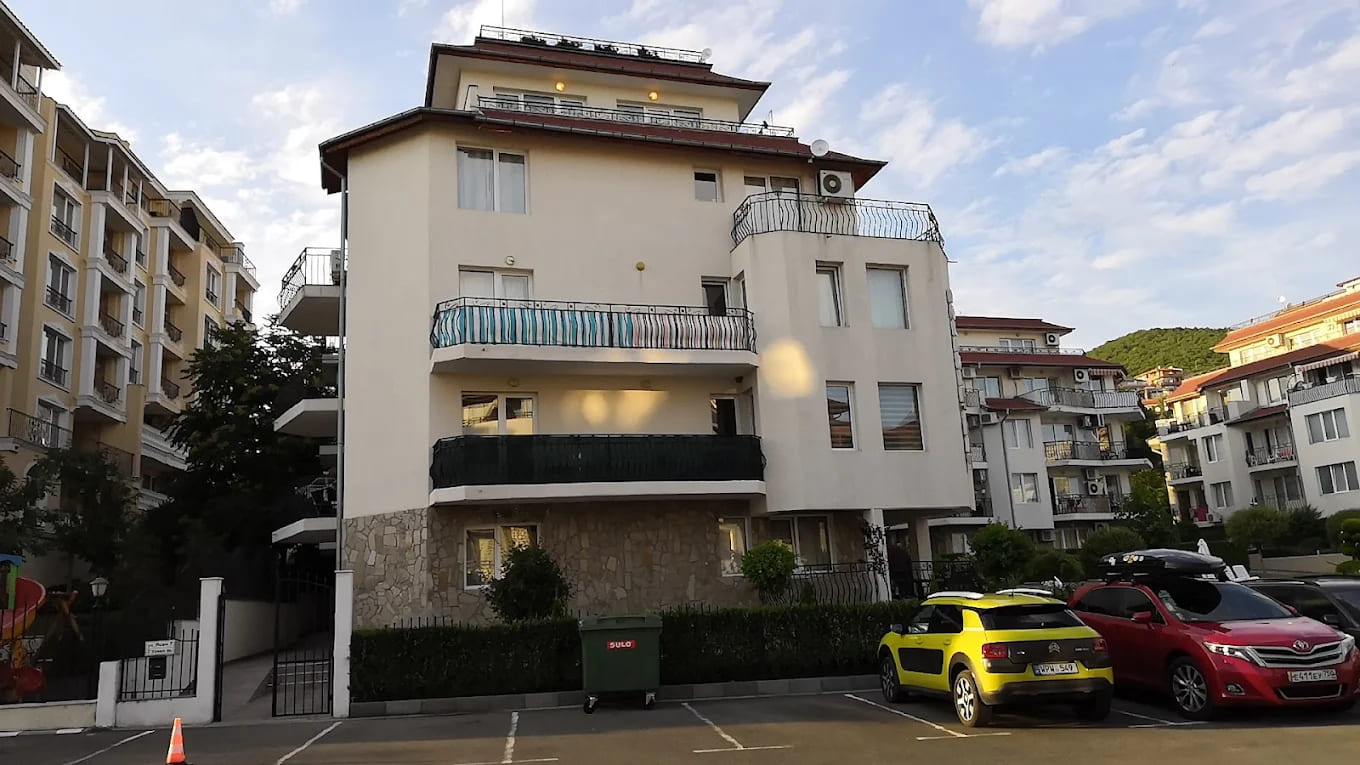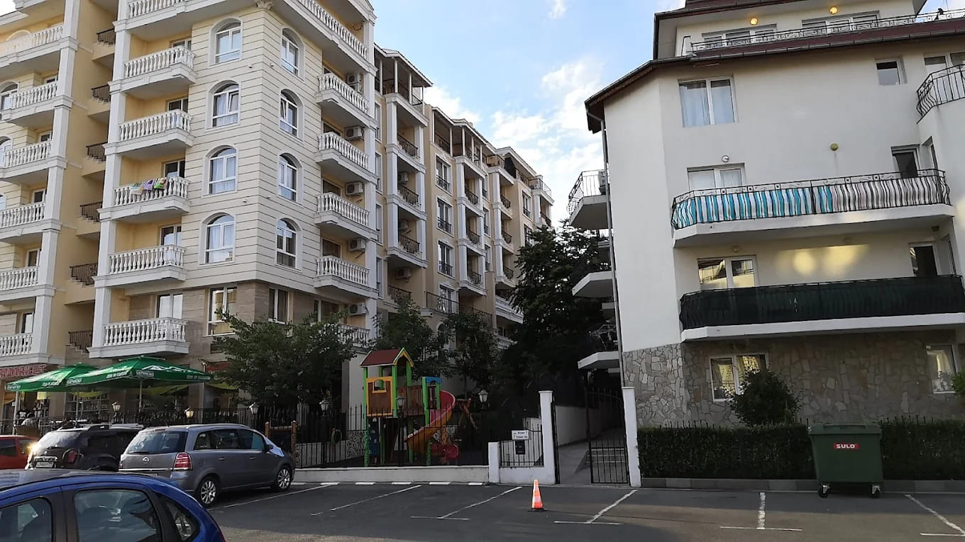 Пятиэтажное здание разделено на четыре секции, каждая оснащена лифтом. Архитектура выдержанная, светлый фасад, просторные балконы. Большинство апартаментов имеют вид на море 🌊, а часть — на горы Стара Планина ⛰️. Это редкое сочетание, которое и формирует особый микроклимат курорта.