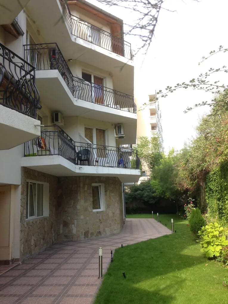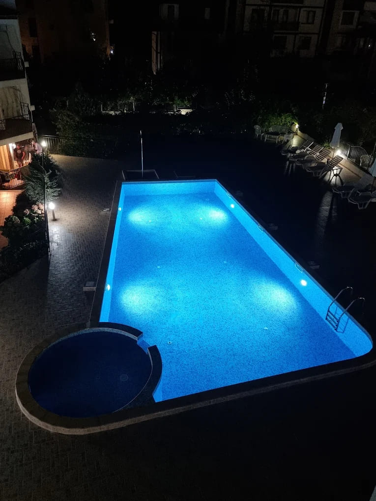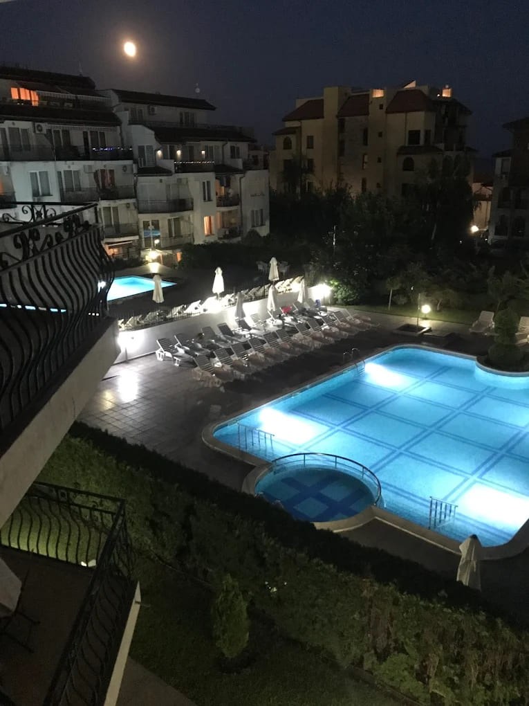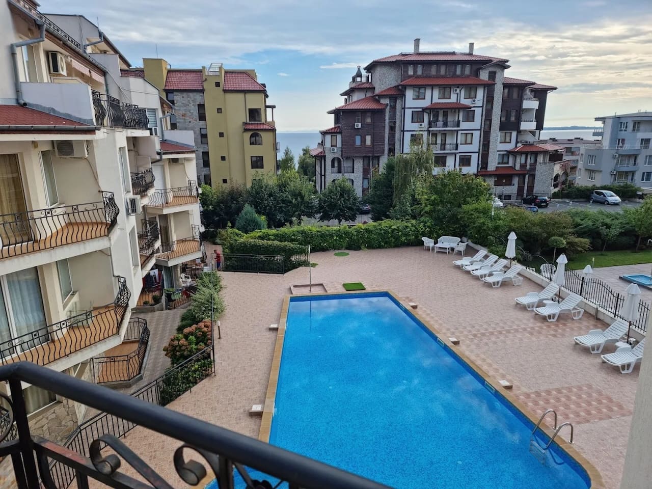 Пятиэтажное здание разделено на четыре секции, каждая оснащена лифтом. Архитектура выдержанная, светлый фасад, просторные балконы. Большинство апартаментов имеют вид на море 🌊, а часть — на горы Стара Планина ⛰️. Это редкое сочетание, которое и формирует особый микроклимат курорта.