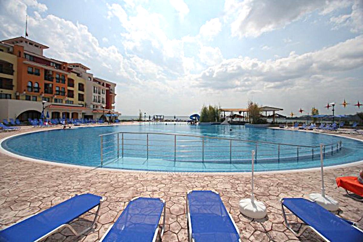 До супермаркетов Жанет, Т-Маркет, Младость — всего 5–15 минут на авто. Есть остановки транспорта, школы, поликлиники и бытовая инфраструктура. Пляж — прямо за воротами комплекса.