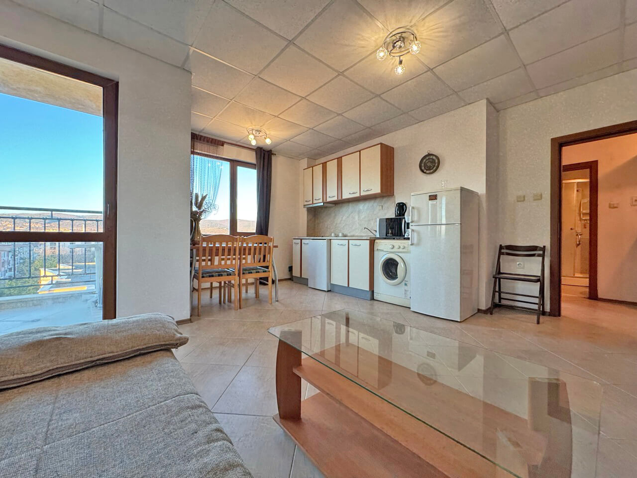 Стоит лишь открыть входную дверь — и квартира наполняет ощущением света, простора и тёплой курортной энергии. С шестого этажа открываются виды, которые каждый день напоминают: море и отдых — не мечта, а часть вашей новой реальности. Комплекс Amadeus 3 расположен в центре Солнечного берега, в шаговой доступности от пляжей и прямо напротив яркого семейного аквапарка Action.