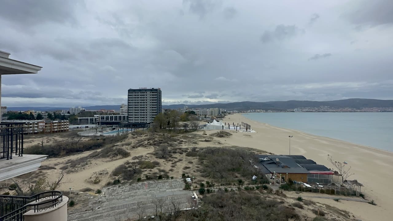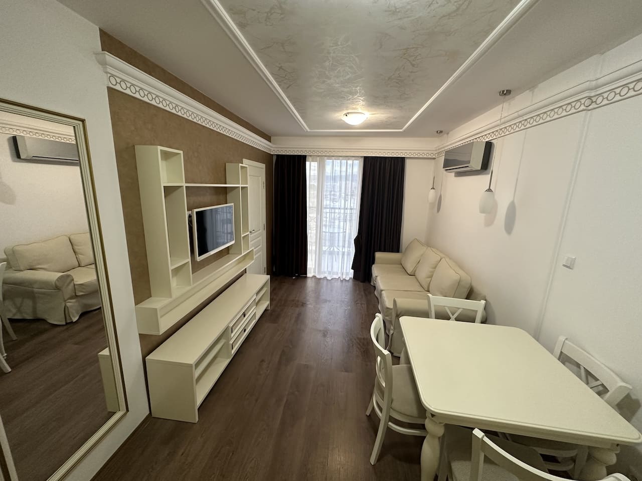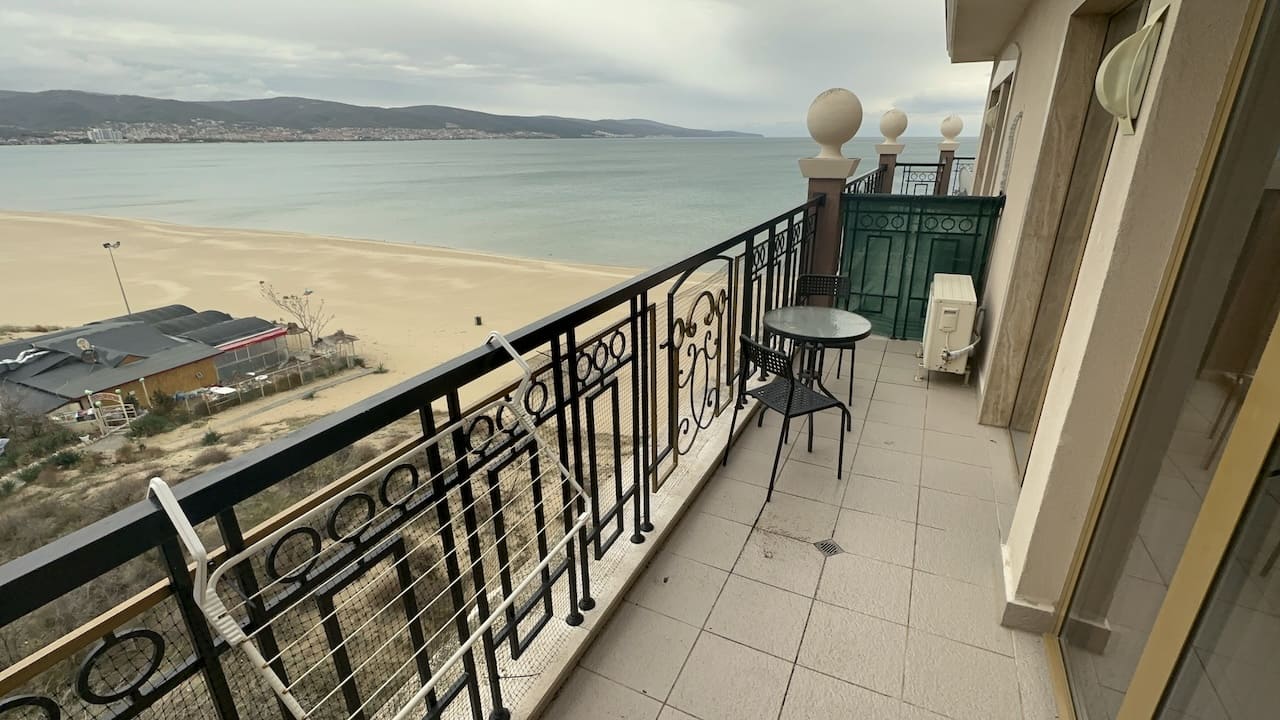 Кондиционер в гостиной для поддержания комфортной температуры в любое время года.Такса поддержки общих частей отеля 14€/кв.м в год.Расстояние до моря менее 50 метров, отель построен практически на пляже.В шаговой доступности от отеля располагаются: рестораны, кафе, магазины и другие удобства.