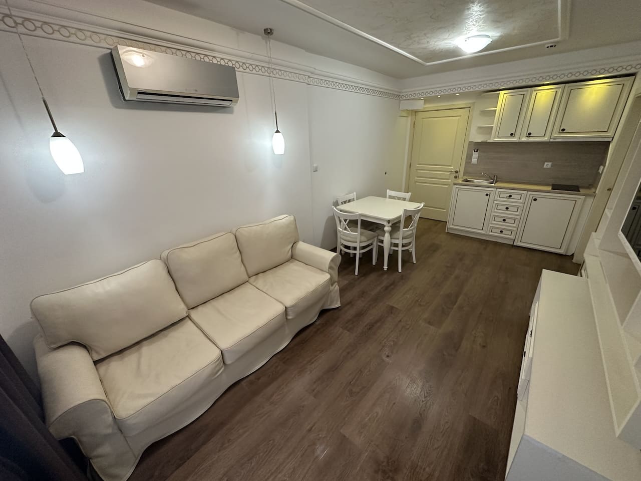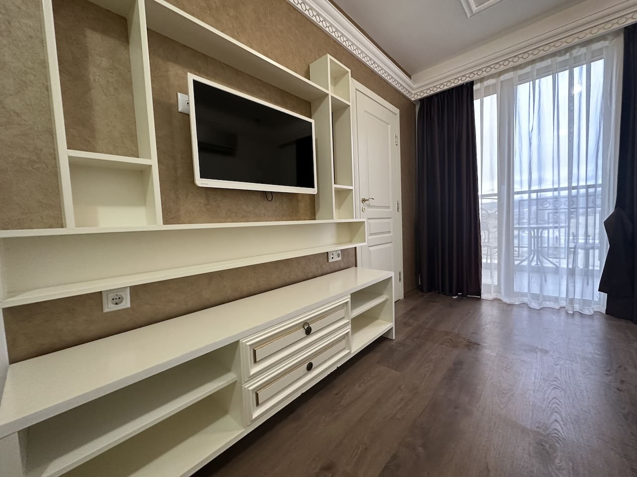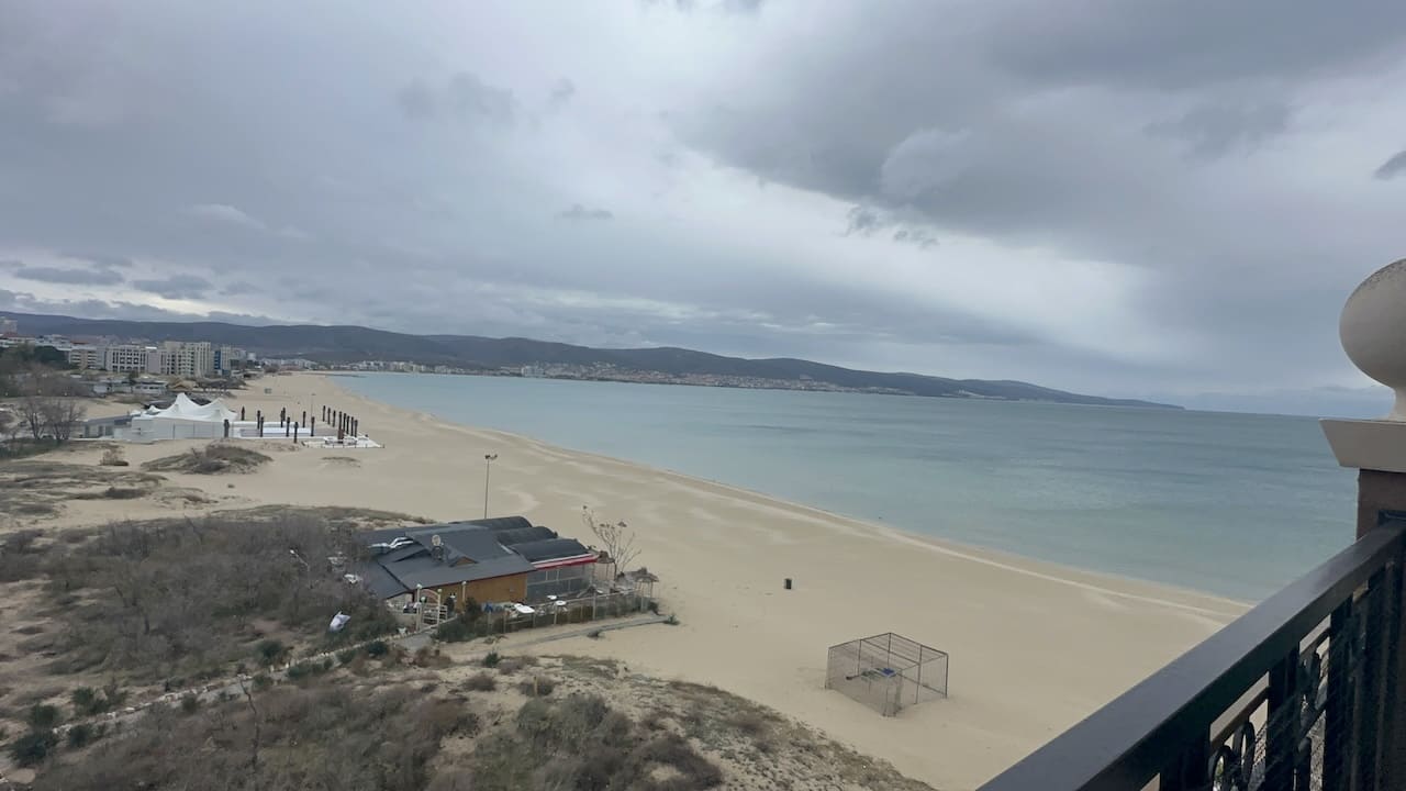 Кондиционер в гостиной для поддержания комфортной температуры в любое время года.Такса поддержки общих частей отеля 14€/кв.м в год.Расстояние до моря менее 50 метров, отель построен практически на пляже.В шаговой доступности от отеля располагаются: рестораны, кафе, магазины и другие удобства.