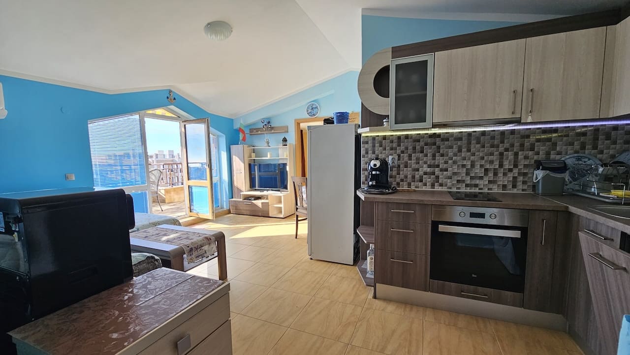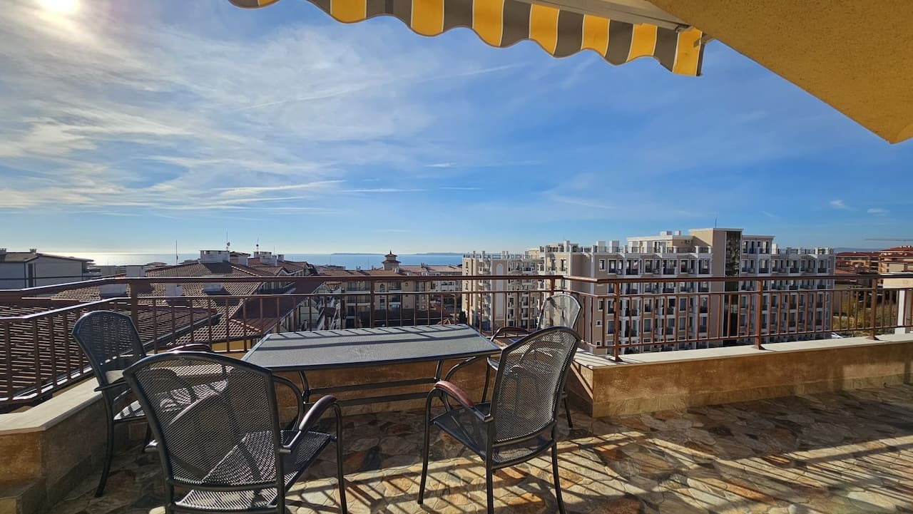 Предлагаем к продаже двухкомнатную квартиру общей площадью 78,56 кв.м, расположенную на третьем этаже жилого комплекса Дольче Вита 2 в курортном городе Святой Влас. Апартамент состоит из просторного коридора, гостиной с функциональным зонированием (кухня, столовая и зона отдыха), одной спальни, двух санузлов и террасы с панорамным видом на море. Терраса оборудована мебелью для отдыха и зоной для барбекю, что делает её идеальным местом для наслаждения морскими пейзажами и свежим воздухом.
