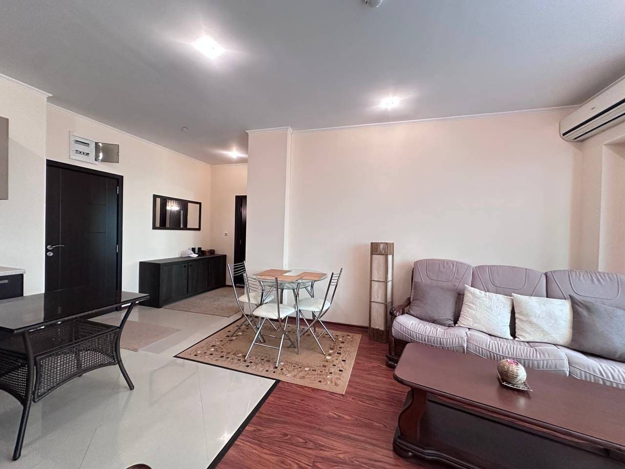 Квартира площадью 120 м² встречает вас широким коридором, откуда удобно попасть в каждую зону. В гостиной объединены кухня, обеденная и жилая зоны. Здесь мягкий диван, телевизор, кондиционер, стеклянный стол со стульями — всё продумано до мелочей.