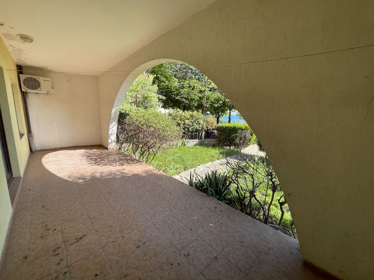 - 🌴 Просторная открытая терраса в тени арки с видом на море и выходом в сад 🌿