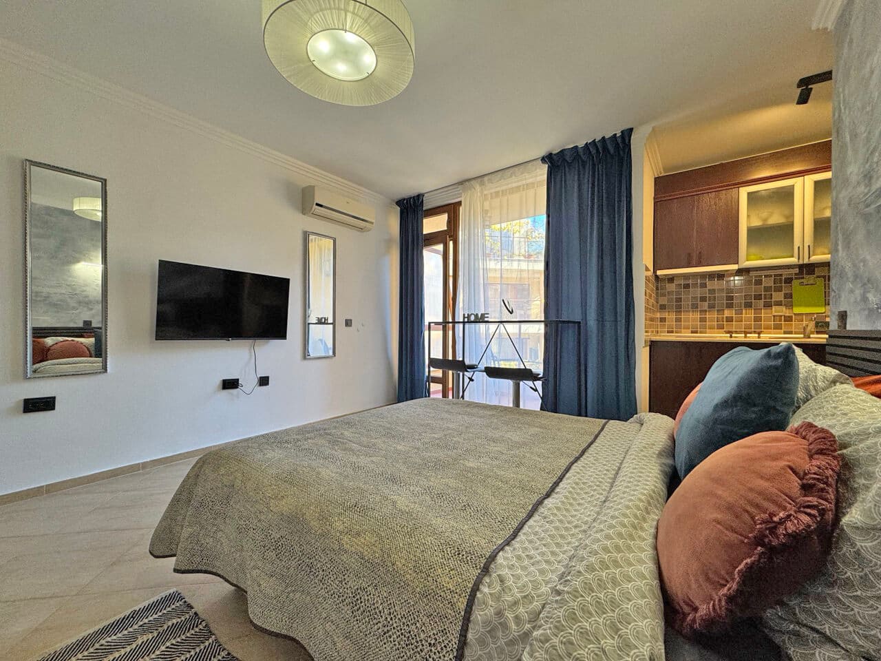 Уют начинается с мелочей. И в этой студии всё на своих местах: мягкий свет, приятные ткани, чистые линии интерьера и утренний воздух с террасы, наполненный ароматом кипарисов и морской свежести.
