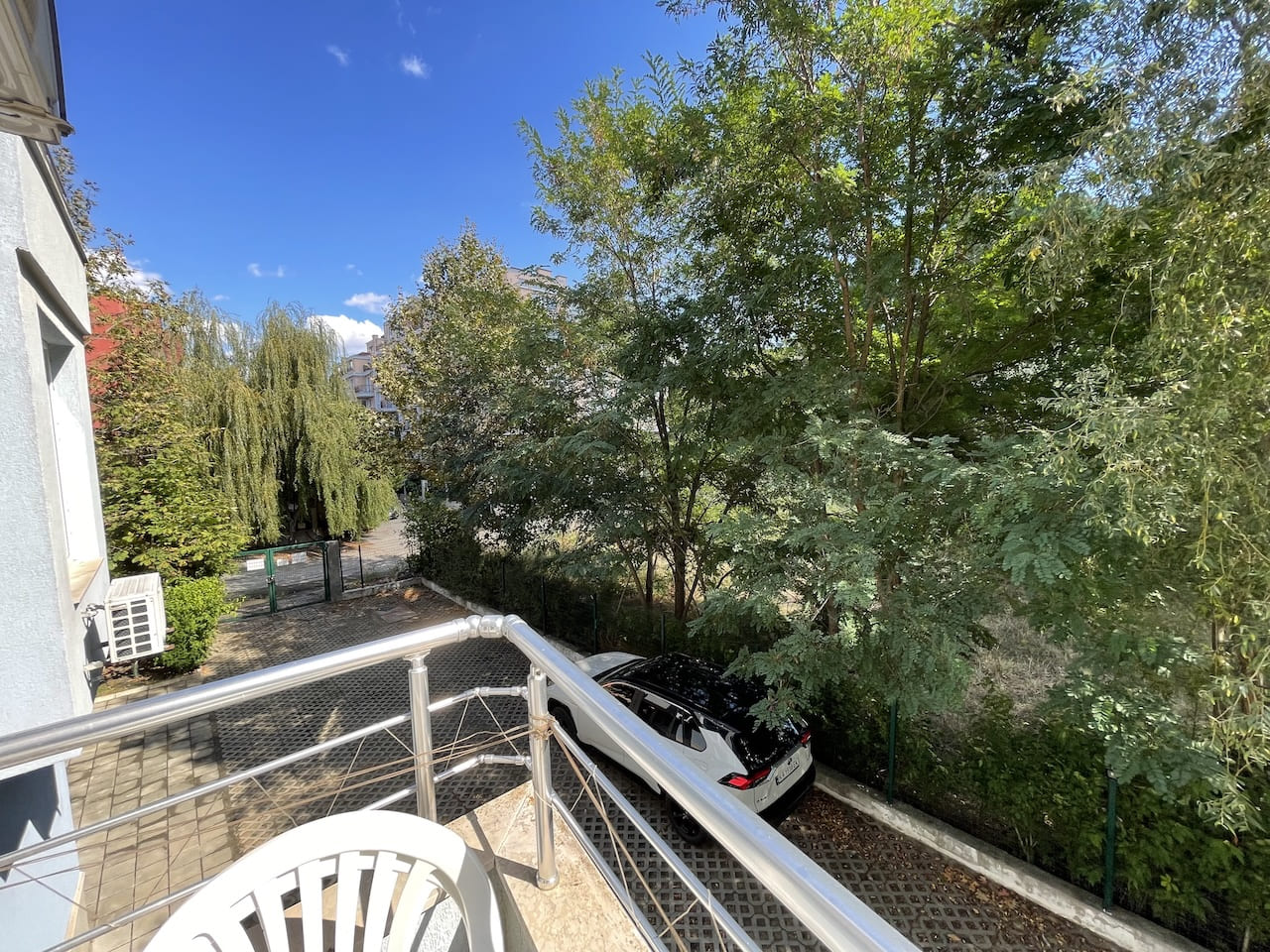 Отсюда просматривается зелёный участок и парковка комплекса, а не окна соседнего дома — ощущение личного пространства сохраняется.