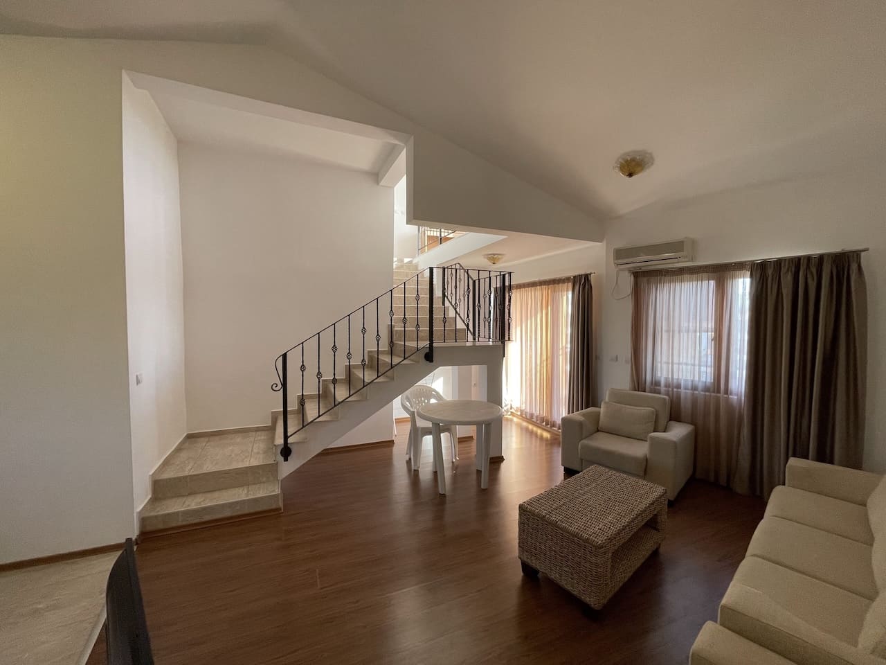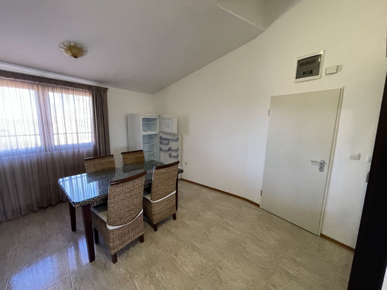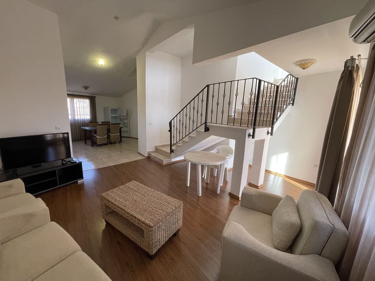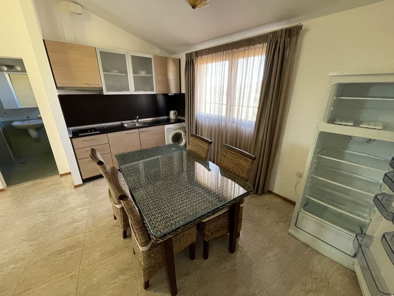 Здесь расположены: аккуратный коридор, кухня как отдельная комната — редкость для болгарских курортных объектов, большая гостиная с зонами отдыха и столовой, санузел для гостей и терасса с видом на бассейн, внутренний двор и море.