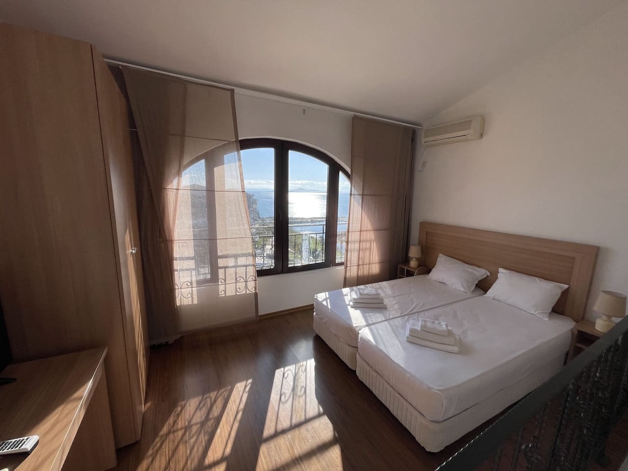 Наверху расположены: спальня с панорамным остеклением, из которой открывается чарующий вид на море, и полноценная ванная комната.