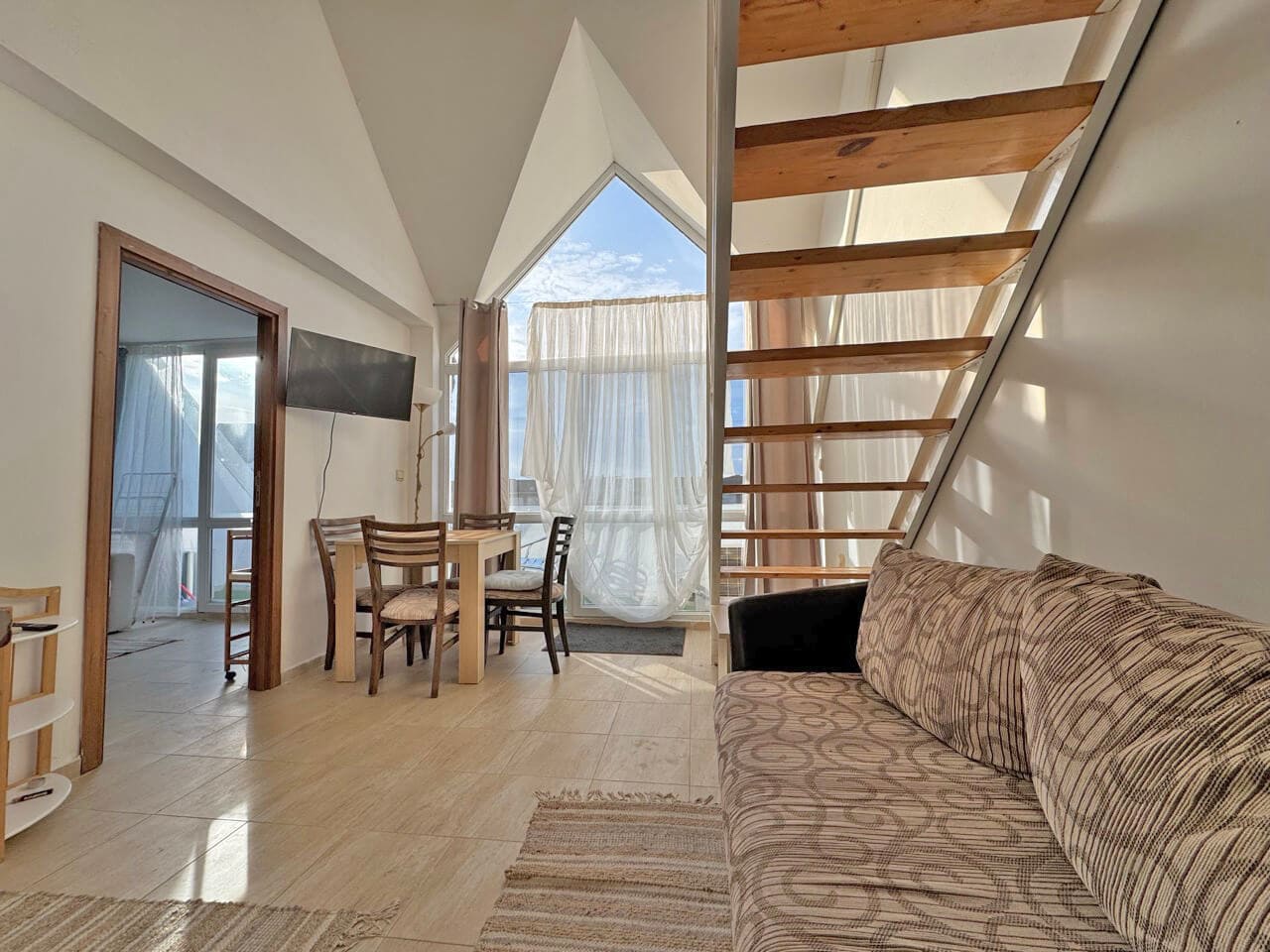 Представьте утро на Солнечном берегу не в эпицентре шума, а в стороне — там, где воздух чище, а день начинается с тишины. Вы выходите на террасу с чашкой кофе ☕, курорт уже проснулся, но до вас доходит только мягкий фон жизни. Именно так ощущается этот мезонет: как личное пространство внутри курорта, а не туристическое жильё «на время».