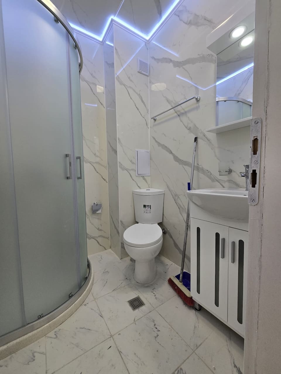 Санузел также после капитального обновления: новая сантехника, свежая плитка, душевая кабина. Тёплый, тактильный свет делает эту зону не только функциональной, но и комфортной.