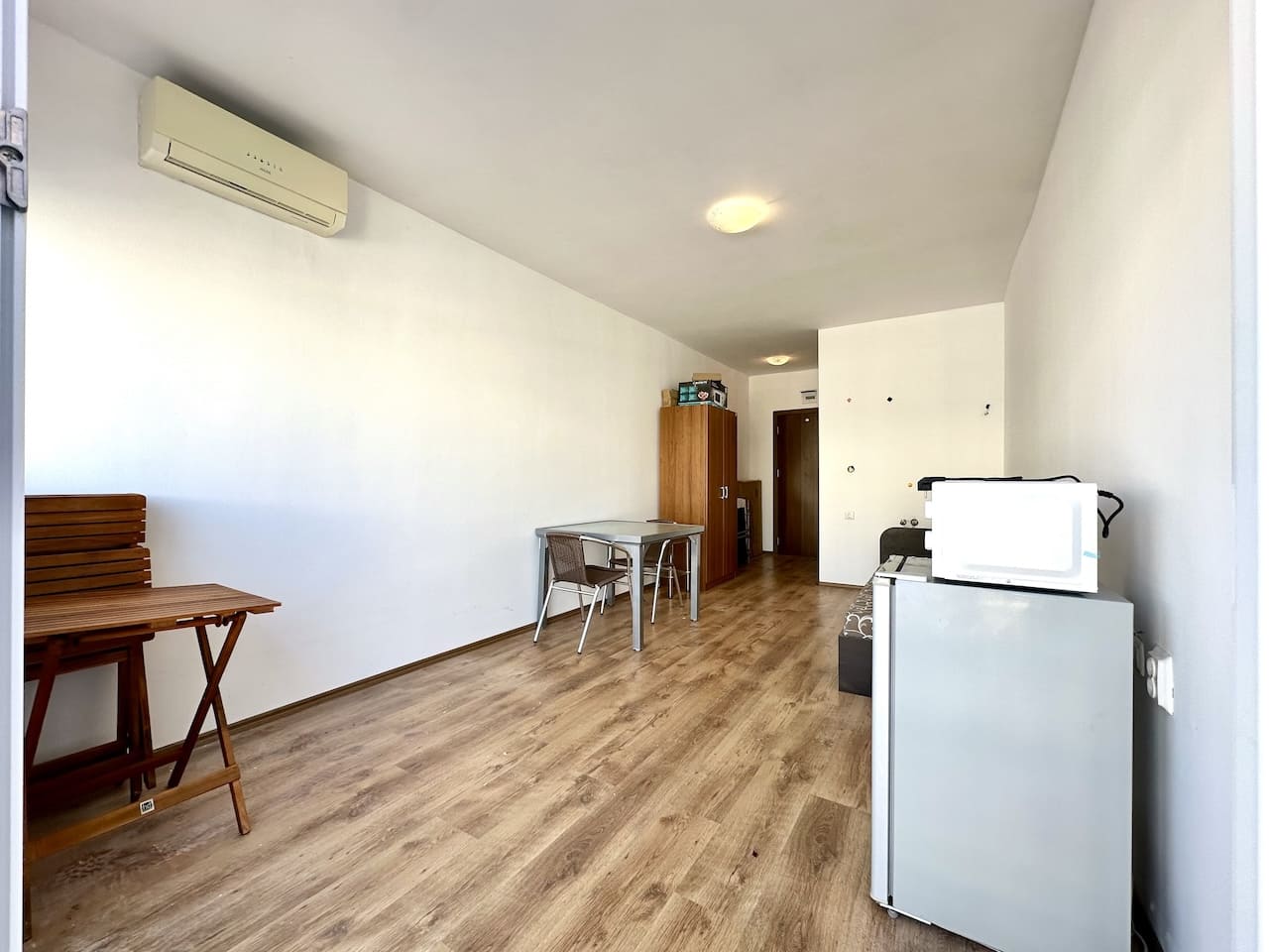 Квартира предлагается к продаже частично меблированной. Установлены кровать, шкаф, обеденный стол со стульями, холодильник, кондиционер. Кухонный блок отсутствует, и этот момент важно проговорить сразу. С одной стороны, это дополнительные затраты. С другой — новый собственник не переплачивает за чужие компромиссные решения. Для агентства такой формат — скорее плюс, если квартира приобретается не «на один сезон», а с расчётом на долгосрочное использование: кухню можно сразу спроектировать под нужный сценарий — компактную для аренды или более функциональную для постоянного проживания.