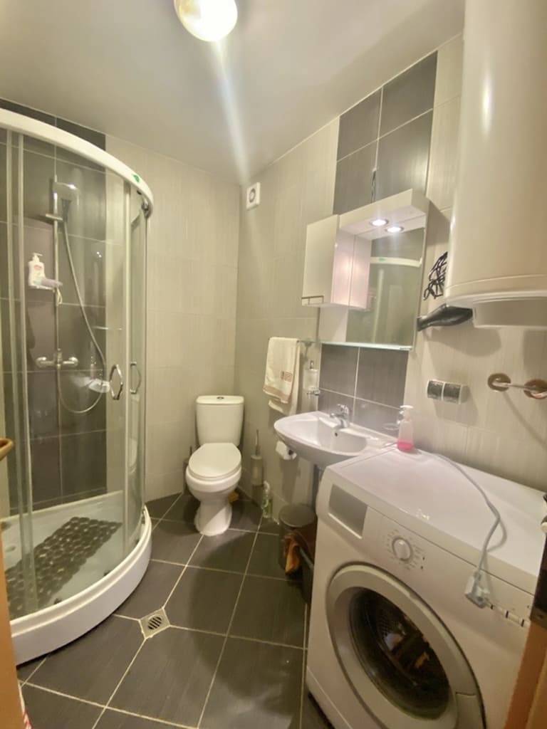 Санузел с душевой кабиной выполнен в нейтральных тонах 🚿, установлена стиральная машина — деталь, которая особенно ценится при проживании не только в сезон.